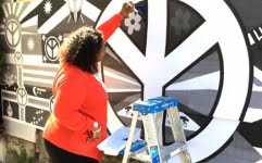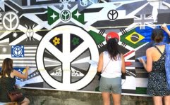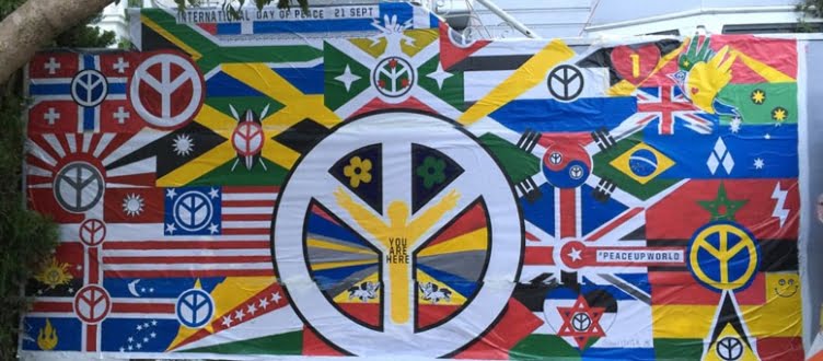 The mural is made from a collection of flags from around the globe with the Peace Up sign added to them. The flags are all united together creating a tapestry of world peace art. In the middle of the mural is one life-size inverted peace symbol that is meant to frame a single person standing in front of it with their arms spread upwards flashing the peace sign.