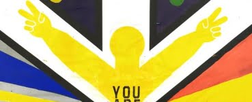 This position is called the, “Celebrated Peace Pose” because the upright peace sign resembles the human body with two arms rising up. Within the large Peace Up sign is a yellow icon of a person assuming the position with text over it stating “You Are Here”, indicating to stand in front of the sign and replicate.